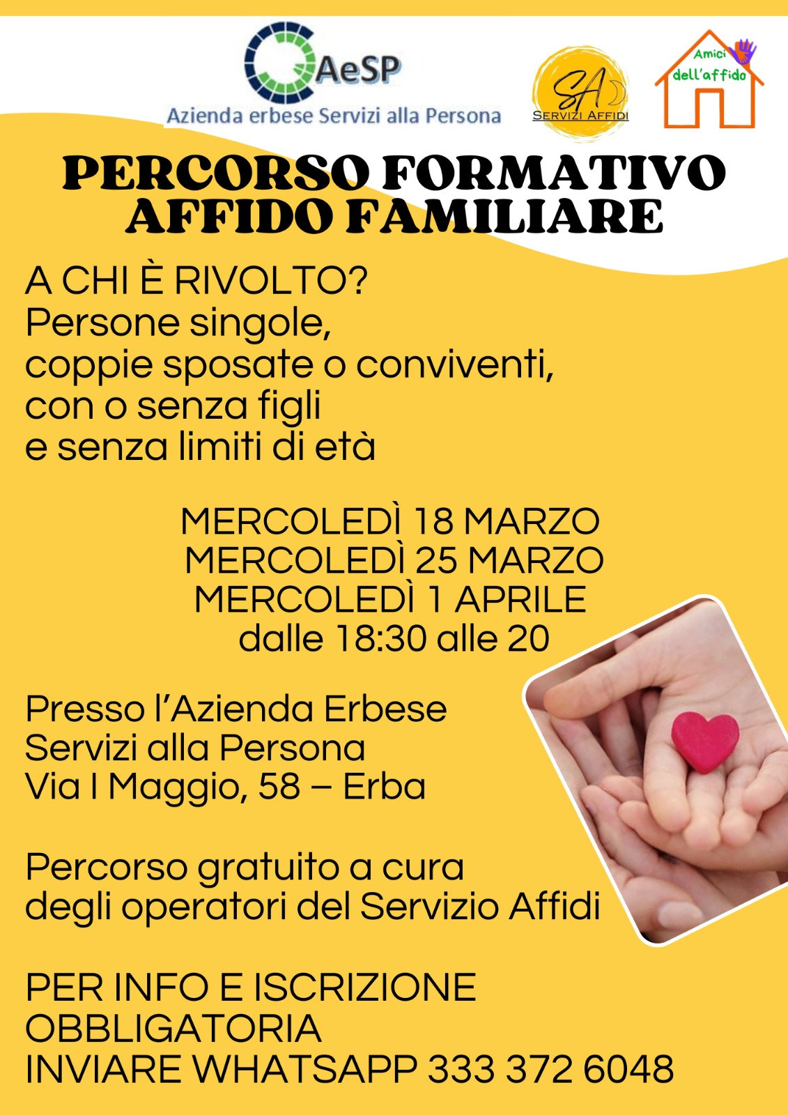 Aderendo alla richiesta dell'Azienda Erbese Servizi alla Persona, si allega il volantino relativo al prossimo percorso, a cura del Servizio Affidi afferente al Servizio Minori e Genitorialità, relativo all'affido familiare che sarà effettuato presso la sede dell'Azienda erbese.